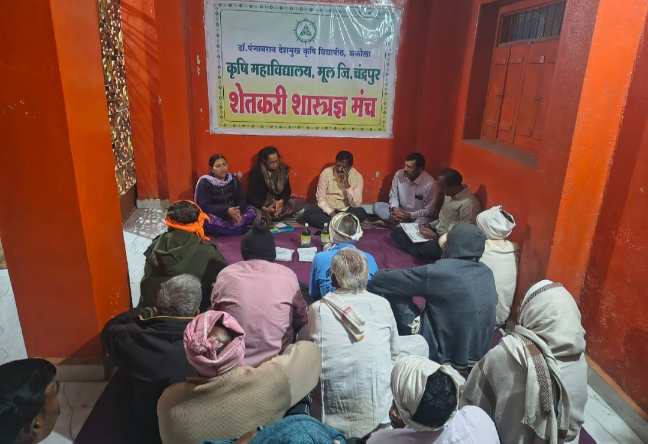 मूल येथील कृषी महाविद्यालय द्वारा 37 वी शेतकरी शास्त्रज्ञ मंचाची बैठक दिनांक ३० डिसेंबर, २०२५ मंगळवार रोजी मूल तालुक्यातील ग्राम चिचाळा येथे संपन्न झाली. याप्रसंगी कृषी महाविद्यालय, मूलचे सहयोगी अधिष्ठाता डॉ. व्ही. जी. अतकरे, प्रगतशील शेतकरी रविंद्र गुरुनुले, एकनाथ लेनगुरे, तसेंच इतर शेतकरी बांधव सह कृषी महाविद्यालय, मुल येथील विषयतज्ञ मंडळी उपस्थित होती. या बैठकीत मुख्यतेने “भात काढणीनंतर रब्बी हंगामात विविध पिकांची लागवड व अळिंबी उत्पादन पर्यायी उत्पनाचे एक साधन” या विषयावर चर्चा करण्यात आली. महाविद्यालयाचे सहयोगी अधिष्ठाता डॉ. व्ही. जी. अतकरे यांनी, शेतीत होणाऱ्या  खर्च कमी करण्यासाठी आणि उत्पादन वाढीसाठी शेतकऱ्यांना मार्गदर्शन केले. रब्बी हंगामात जवस, मोहरी, करडई या पिकांची लागवड करताना योग्य वाणाची निवड करणे, पाण्याचे योग्य नियोजन करणे आवश्यक असल्याचे सांगितले. शेतीतील शाश्वत उत्पादनासाठी माती परीक्षण करणे काळाची गरज आहे तसेच अळिंबी उत्पादन पर्यायी उत्पनाचे एक साधन आहे असे सांगितले. डॉ. एस. वाय. कडू,  सहाय्यक प्राध्यापक, उद्यानविद्या यांनी शेतकऱ्यांनी पारंपारिक उन्हाळी धान ऐवजी वांगे, टमाटर, कोथिंबीर, मेथी  यासारख्या भाजीपाला पिकांची  कमी खर्च करून जास्तीत जास्त उत्पन्न मिळवण्याकरिता भाजीपाला पिकांची लागवड सुधारित तंत्रज्ञानाच्या वापर करण्याबाबत शेतकऱ्यांना सविस्तर मार्गदर्शन केले. डॉ. स्वप्‍नील ठाकरे, कृषिविद्या विषयतज्ञ यांनी सदर कार्यक्रमाचे सूत्रसंचालन केले. भात काढणीनंतर उपलब्ध ओलावाच्या फायदा घेत रब्बी हंगामात जवस व मोहरी या तेलबिया पिकांची पंच: सूत्री पद्धतीने लागवड व व्यवस्थापन करावे. यापासून शेतकऱ्यांच्या अधिक आर्थिक नफा मिळवता येतो सोबतच आरोग्याच्या दृष्टीने दोन्ही पिके अतिशय महत्त्वाचे असल्याचे विषद केले.
